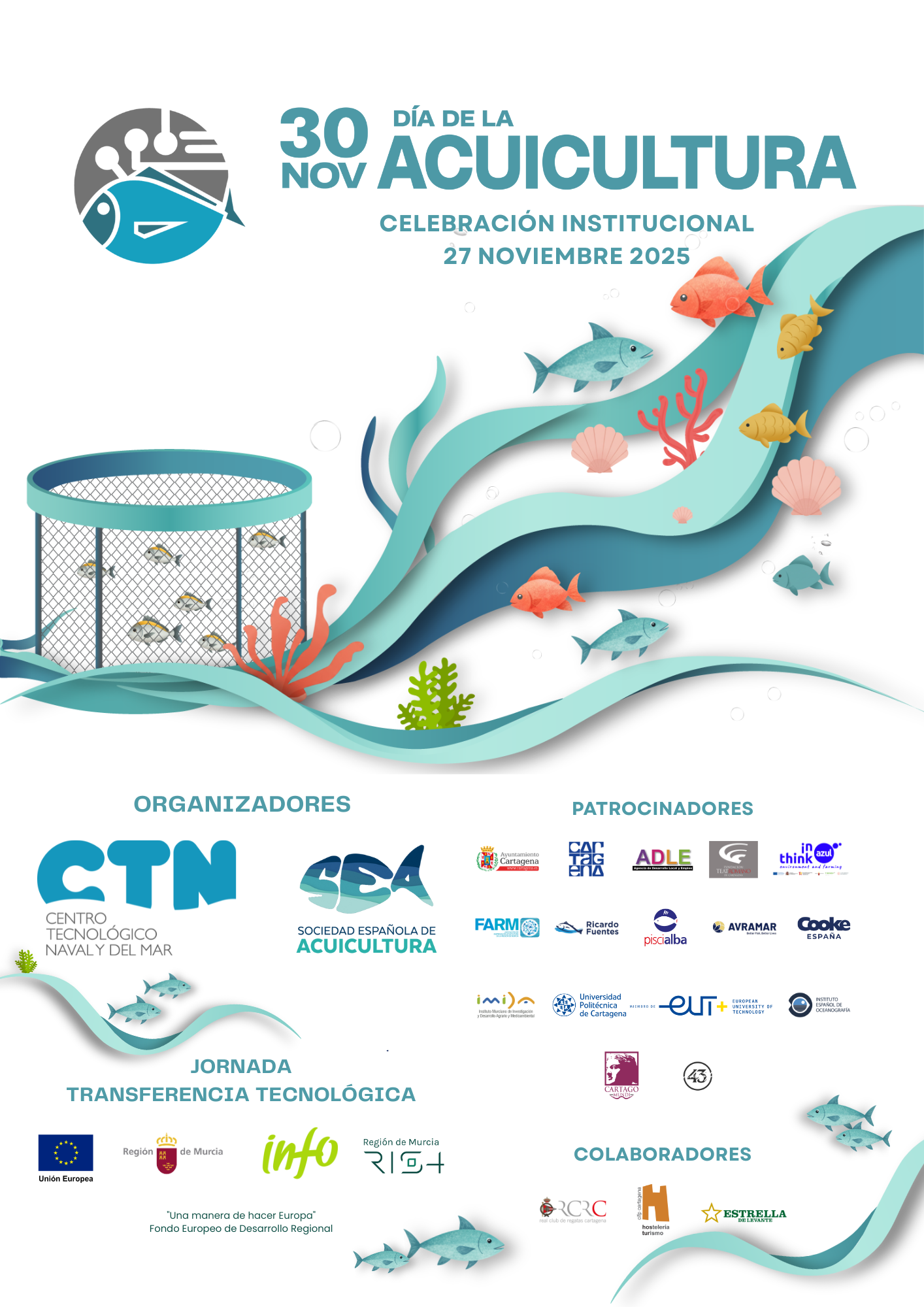 Fuente Álamo, 28.noviembre.2025.– La Región de Murcia se ha convertido, este año, en el escenario principal de la celebración del Día de la Acuicultura 2025, que se conmemora internacionalmente cada 30 de noviembre con actividades que buscan visibilizar un sector, cada vez, más necesario para el bienestar de la población mundial. Los actos institucionales dieron comienzo ayer, día 27, en las instalaciones del Centro Tecnológico Naval y del Mar (CTN), que lideró el evento con el apoyo de la Sociedad Española de Acuicultura (SEA).